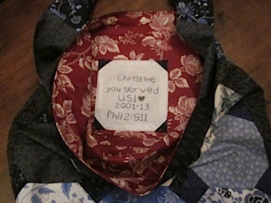 Di B (not a ministry wife, but my good quilting buddy) helped with the task of hand stitching down the binding, which we tackled together, sitting and working on opposite sides of the quilt.